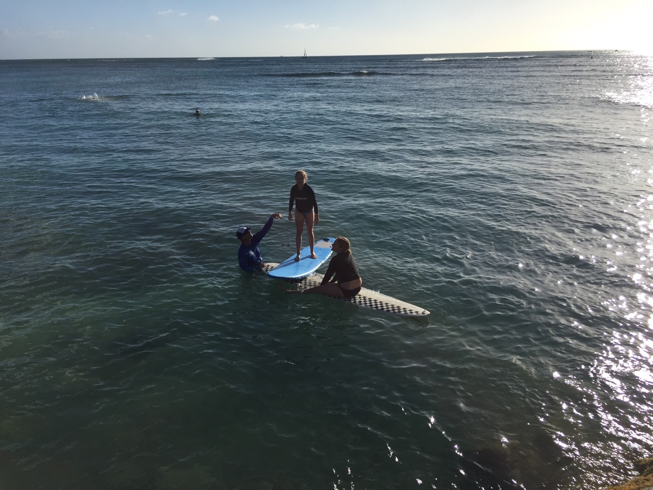 And then he took my nephew out for the same. Then my daughter and niece. He calibrates each lesson for each student, talking easily with all of the kids around him – the ones riding belly boards, the ones chasing fish. After hours of swimming, teaching, dragging kids into the waves, and surfing – on his day off- he shakes hands with folks on the beach, lifts his surfboards (2 – one for him, one for his student) and walks off with them, toward downtown Honolulu.