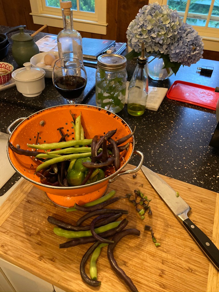 Today was hot and sunny in Holliston. A workday for me, but I had a chance to grab a few things from the garden and grounds. The yellow pear tomatoes and cucumber for lunch, the bush beans for dinner, and some hydrangeas for the counter and peppermint for water.