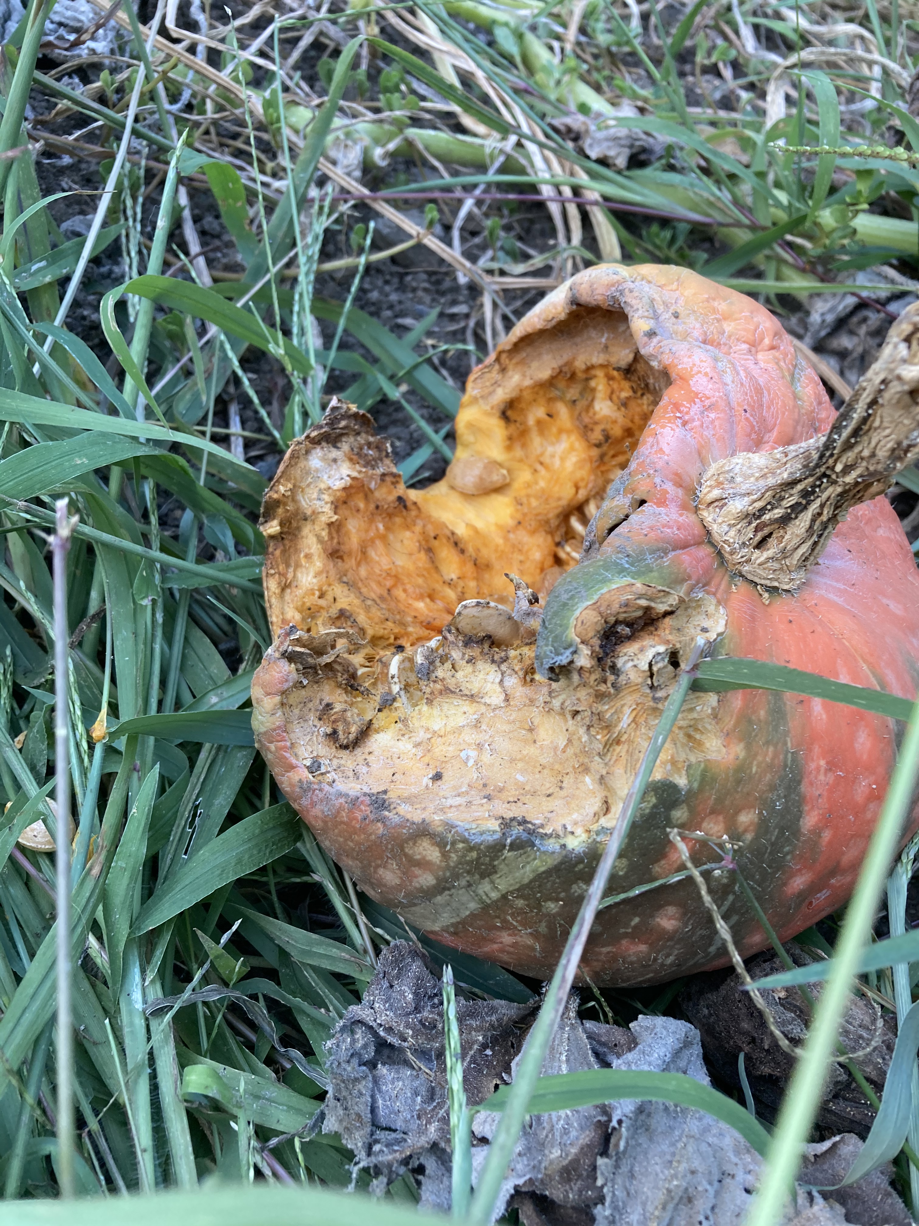 I’m not psyched about losing the decorative pumpkin photographed at top to whatever ate it – a woodchuck? But I am harvesting others that were left untouched, which feels like a kind of fair sharing deal.