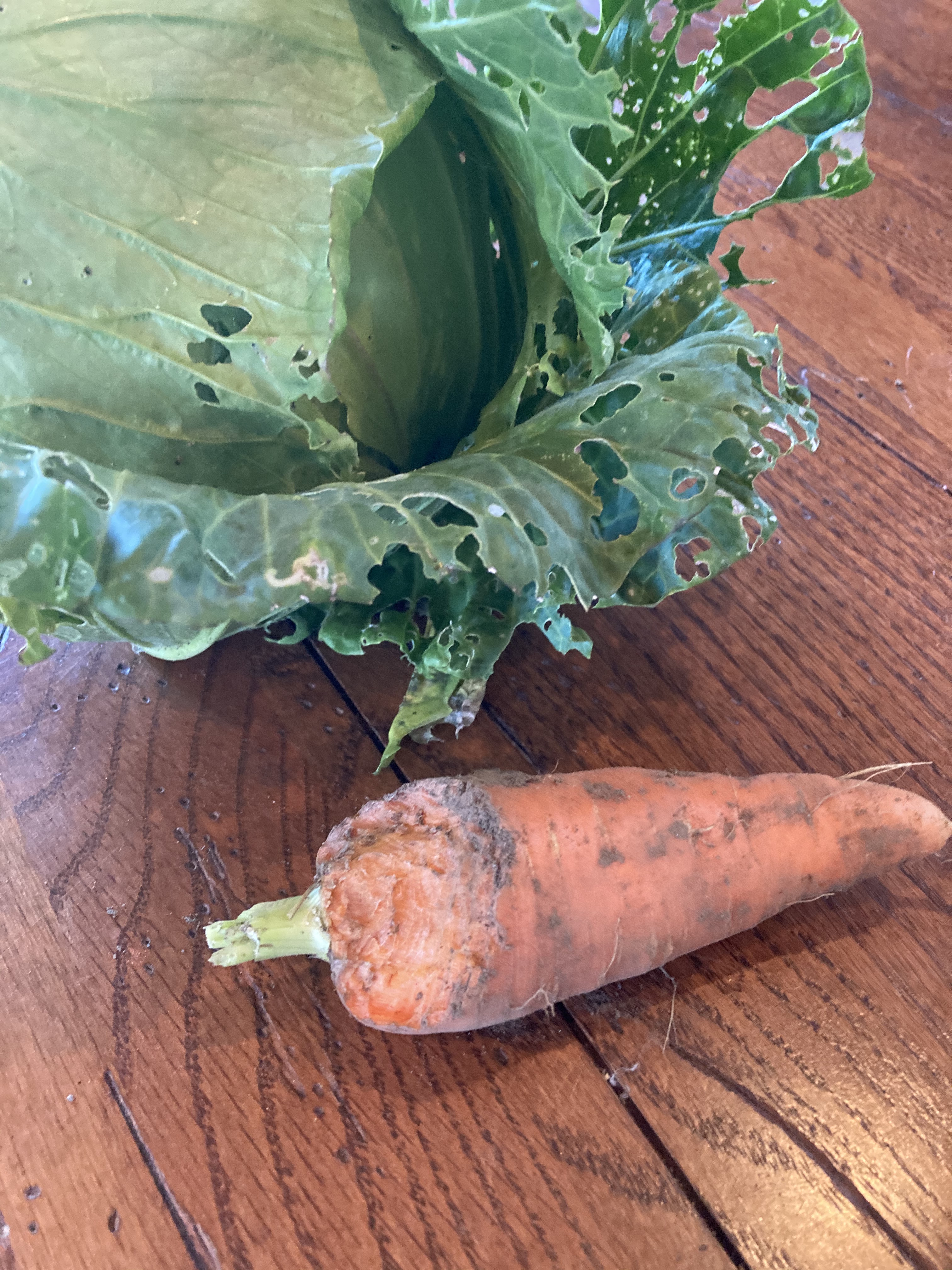 Cabbage – regarded in modern kitchens as humble – has reached the requisite 71-ish days (the seed packet says that’s how long) in my garden and is ready to harvest. On going out do that – exciting! This is my first time growing cabbage! – I found I was not the first to the patch.