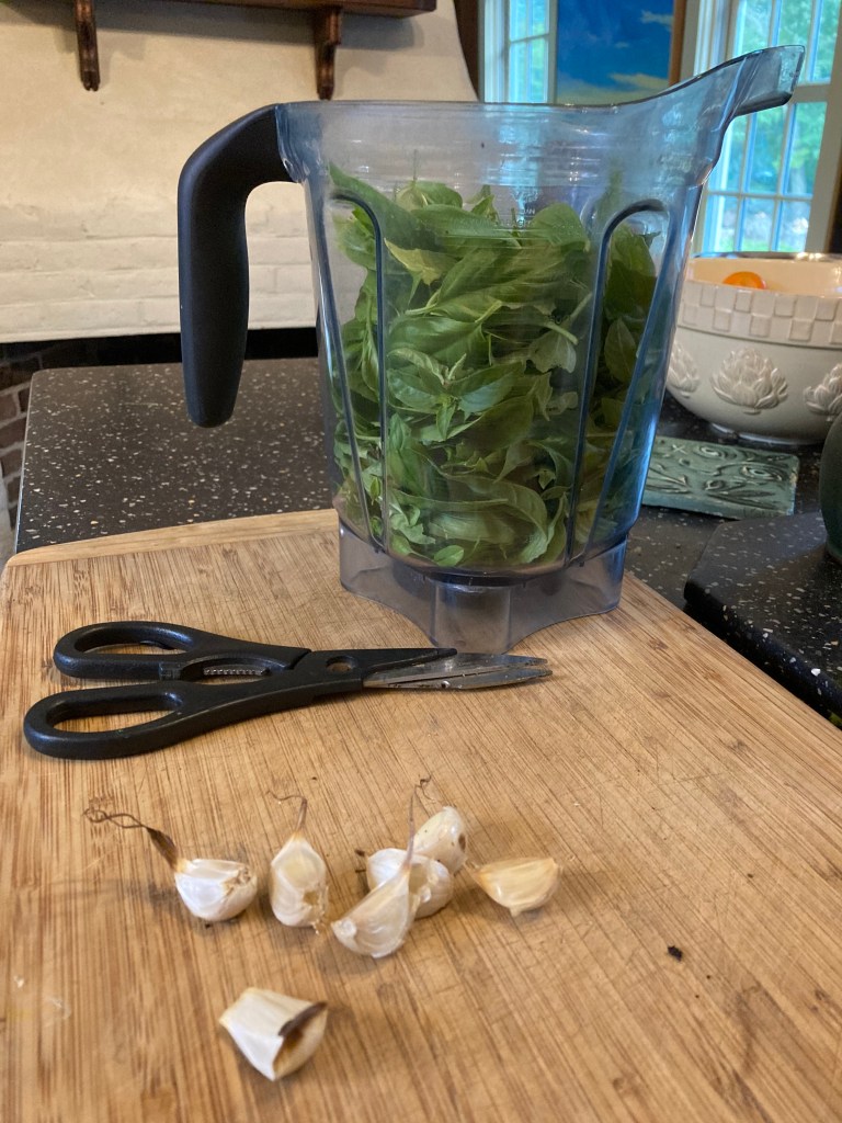 It’s getting cooler at night here in New England, so it’s time to harvest planted basil. I cut about 7 or 8 good size branches for dinner – it will make enough pesto for a box of rigatoni plus two servings. You don’t need much basil to make pesto, drinks, and anything else you’d like to make – it’s easy to grow and it is fragrant and delicious.