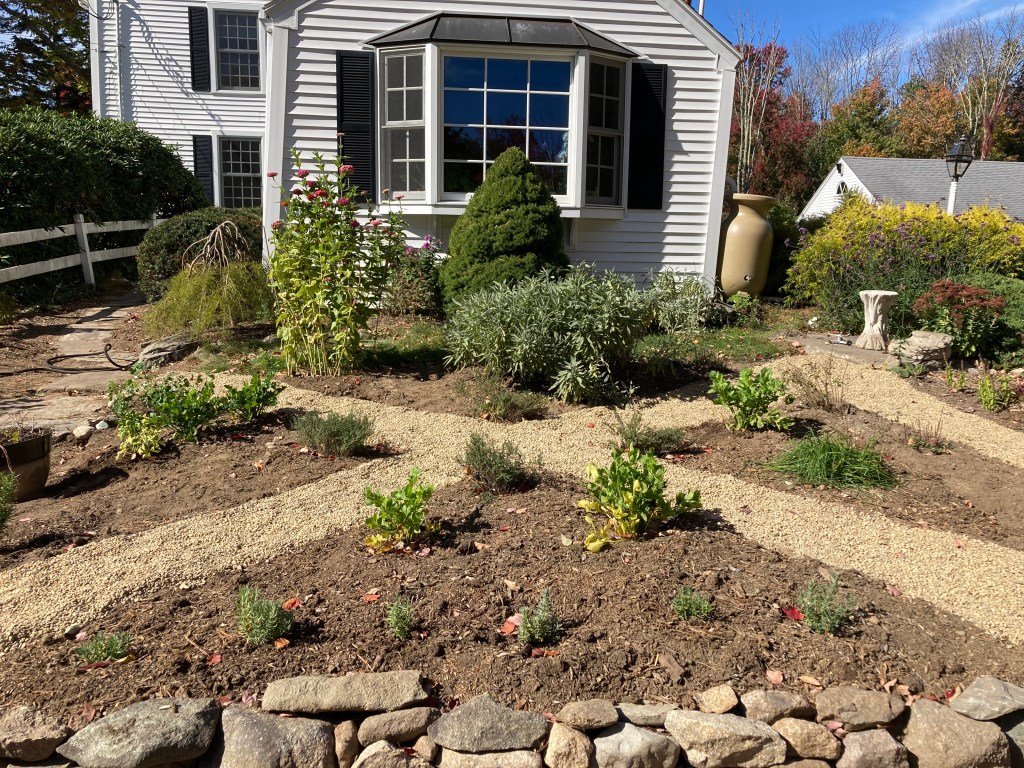 It’s autumn in New England and so creating the structure is what I can do, along with relocating existing plants to their new homes. I’ve been at it for weeks, constructing a stone retaining wall, removing turf, moving plants, laying pea stone: