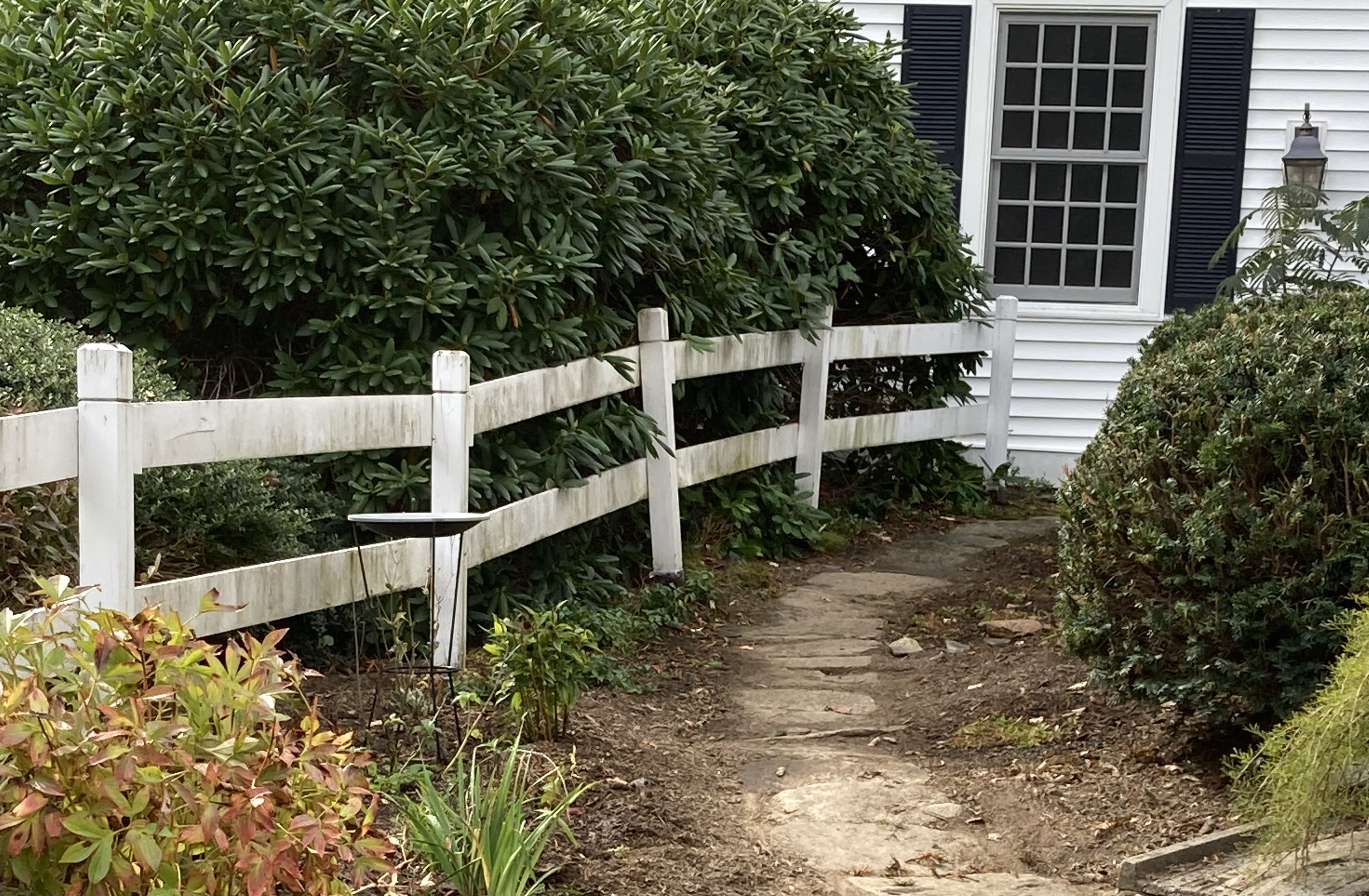 The spot I had in mind next to the kitchen has a slope. It used to be a barn, actually, which is a bit mysterious to me since I would expect the spot the barn stood on to be flat. The barn, now gone, was blown over by a hurricane in 1933. Since the barn’s demise, the spot acquired grass to become a grassy hill next to the house with a few well-established foundation plantings.