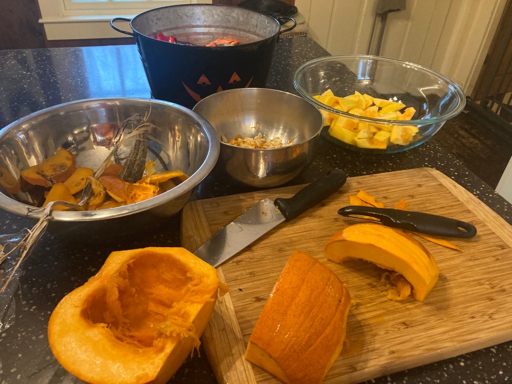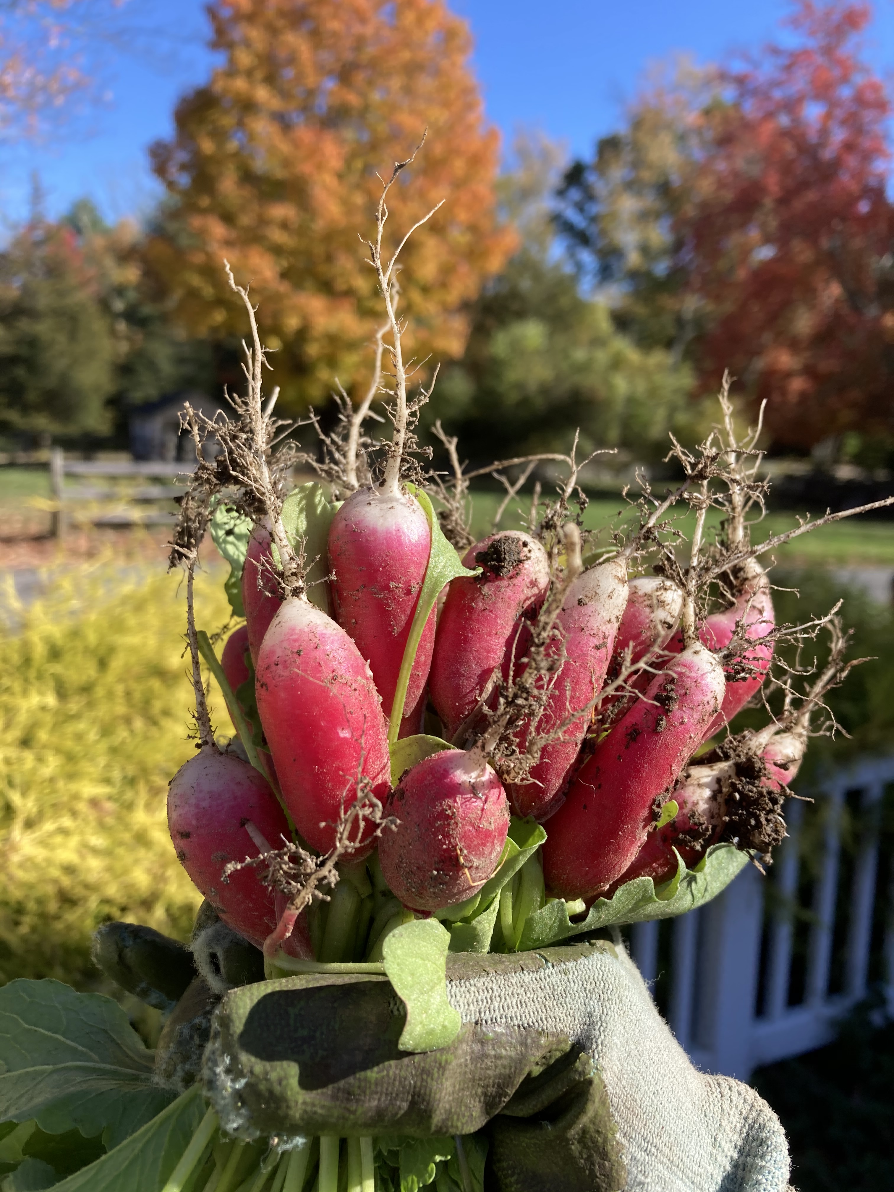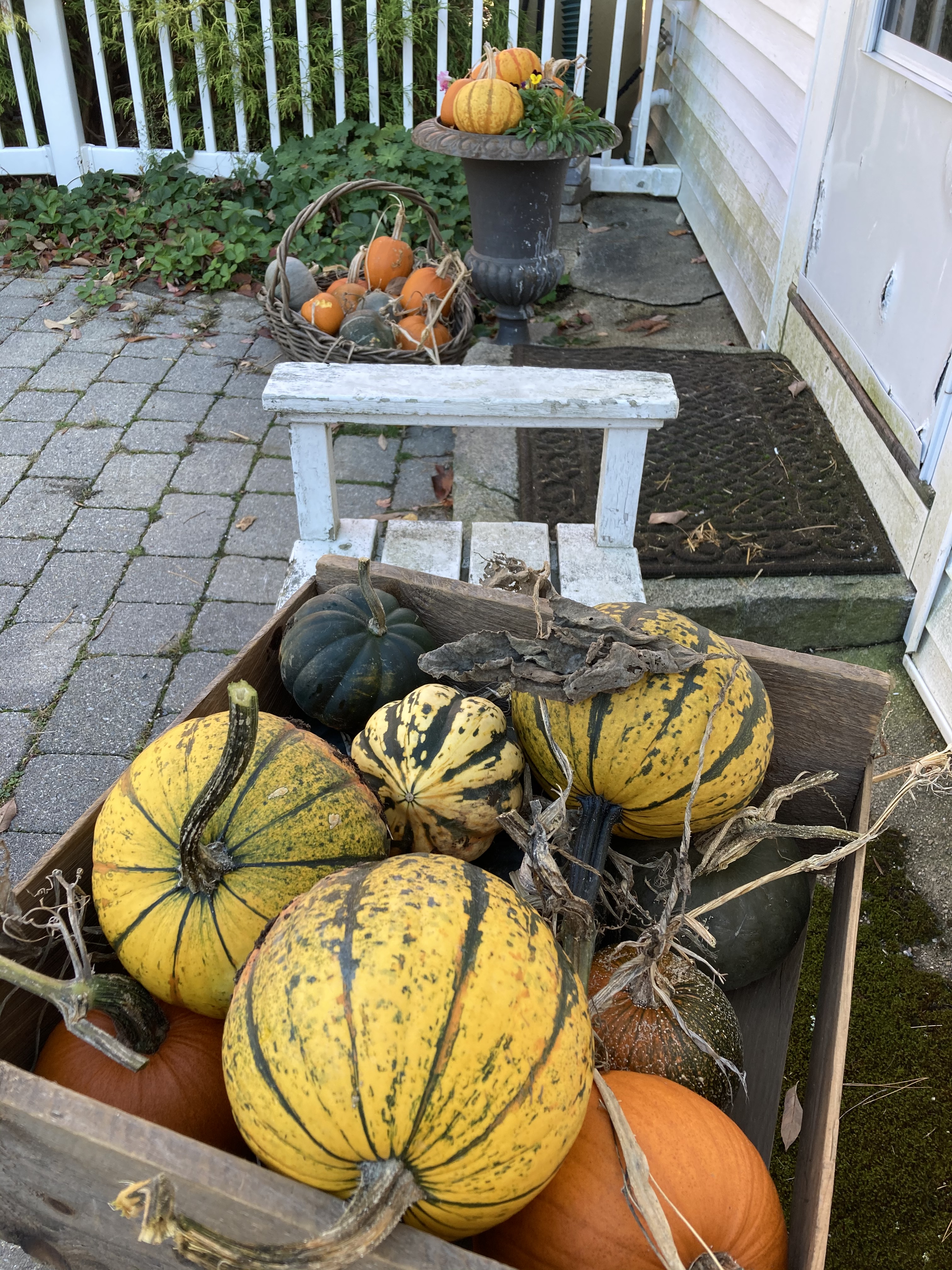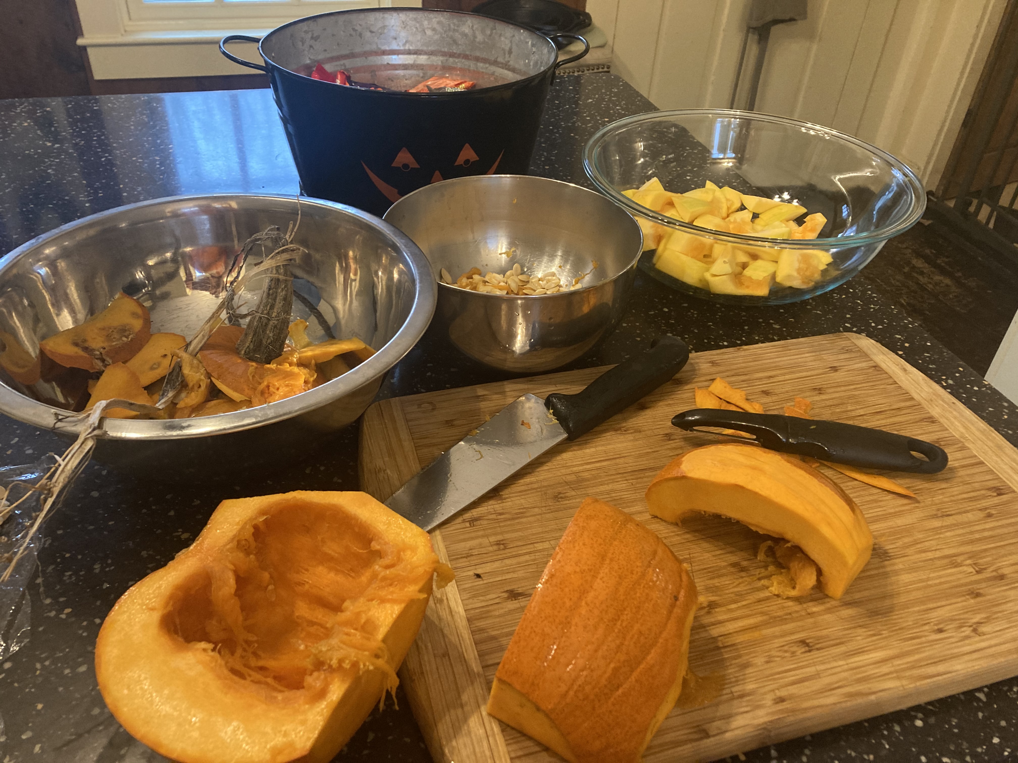 Along with my traditional Halloween activities, this year we had a pile of pumpkins and squash, radish, final peppers and tomatoes to collect.