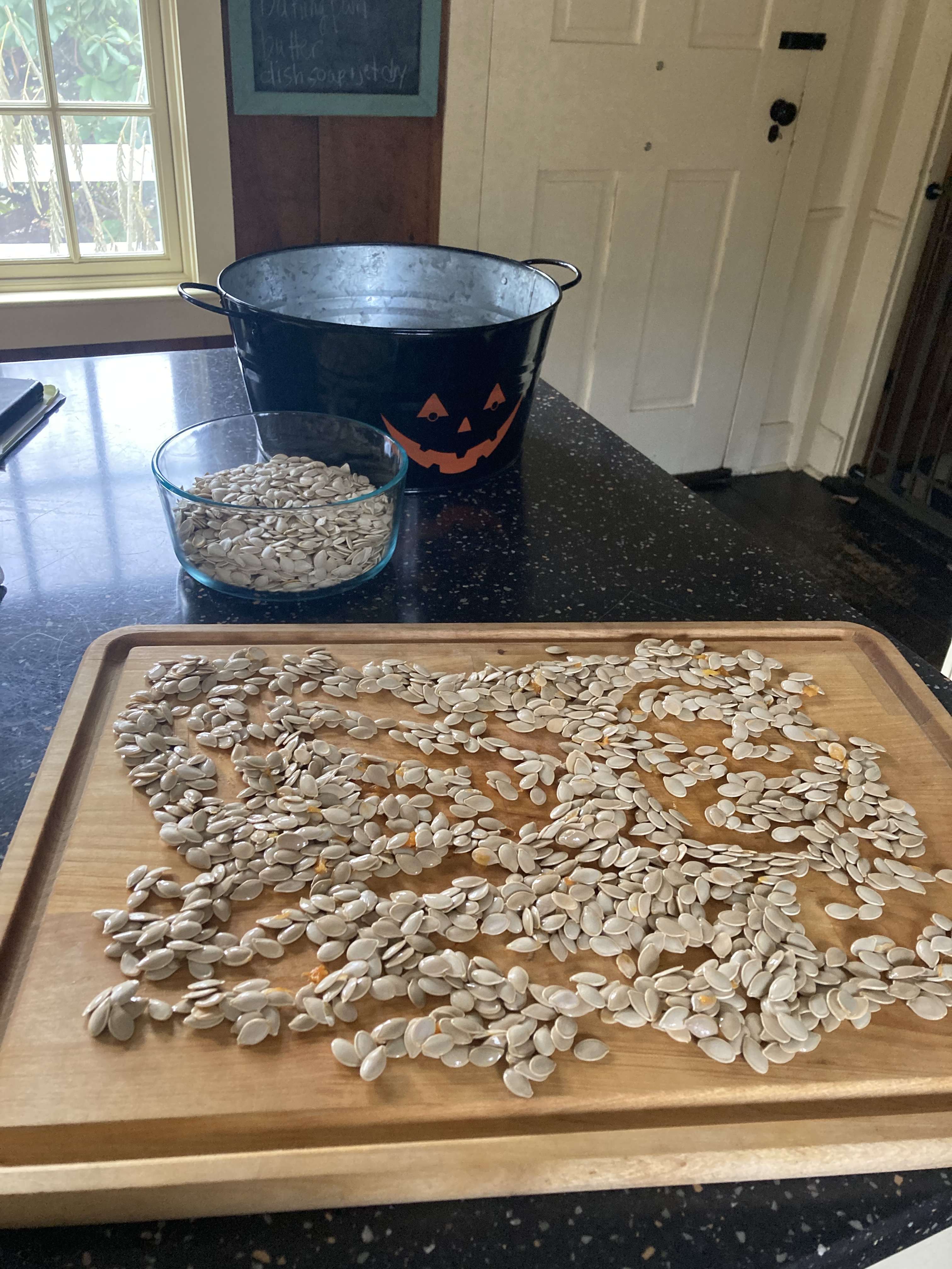 … we are drying them to roast later. I found that a bread board was a good way to dry them since they stick to paper towels, parchment, even plastic.