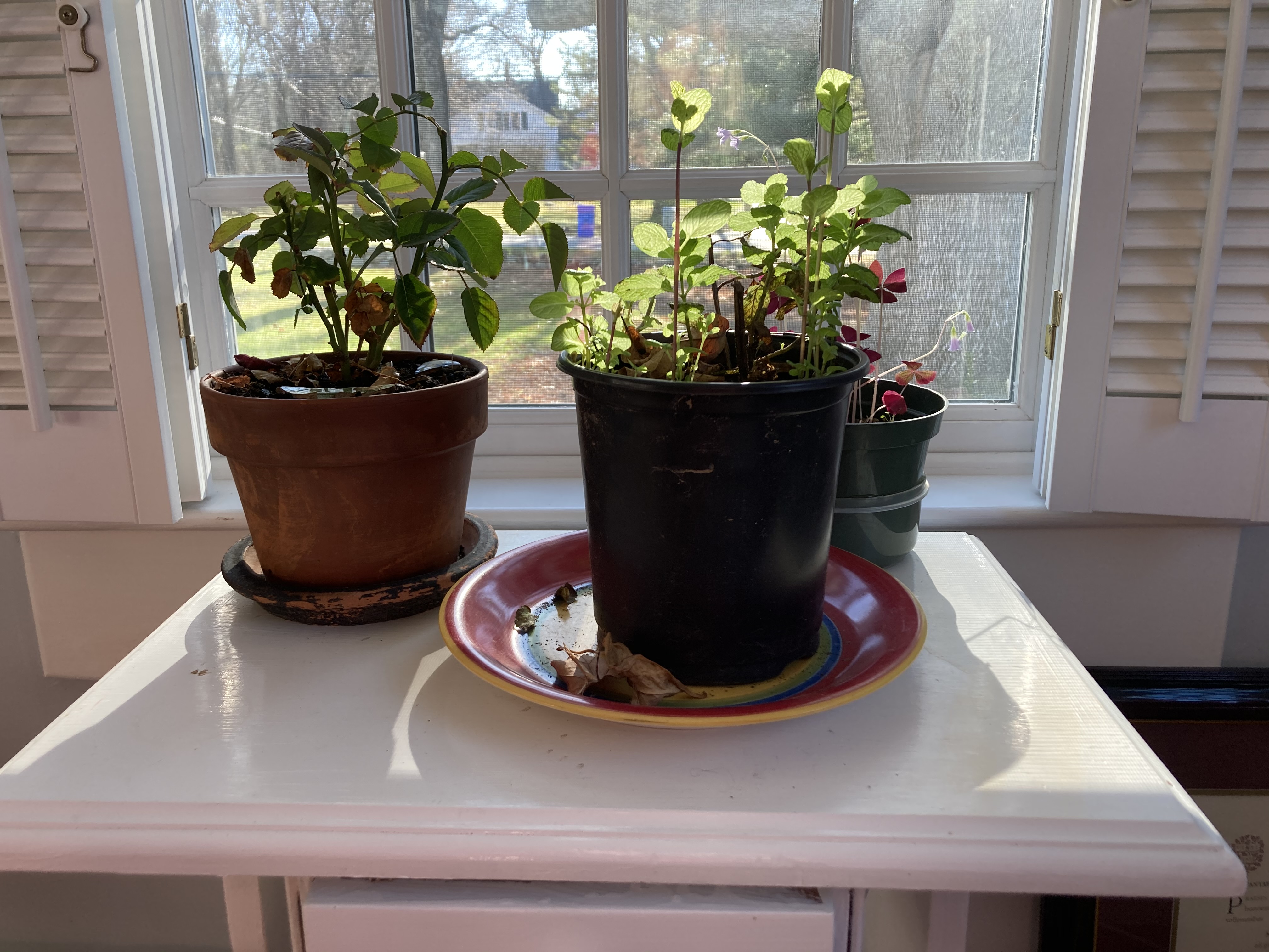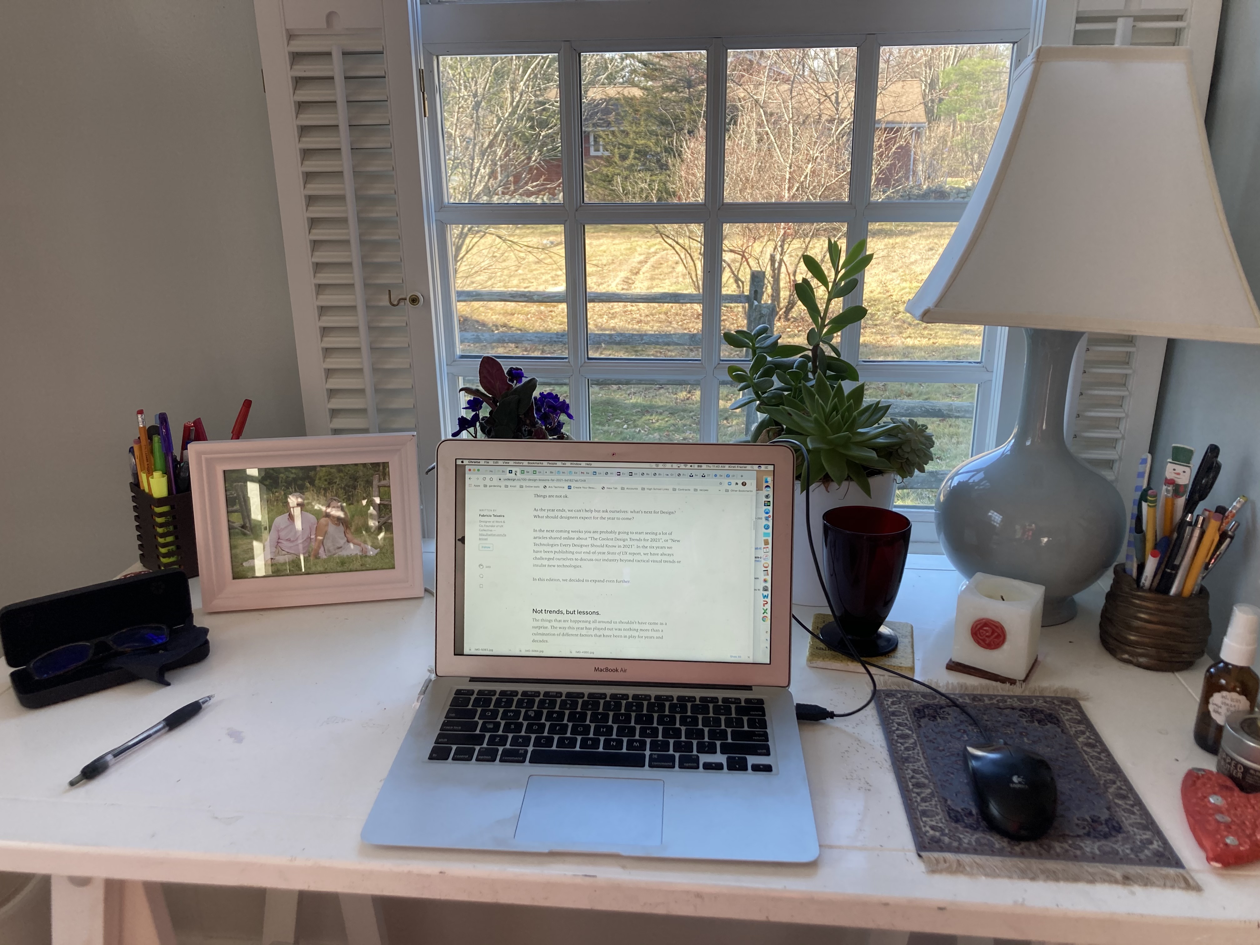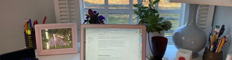 I found it challenging to assemble and share a photo of my space. First, I was busy working. But also, every attempt at settling myself into a space that felt good and comfortable seemed to result in another round of tweaking. The sun was causing glare if I sat here. The space was too cramped if I sat there. The wifi was better on one side of the room than the other owing to the router being upstairs …