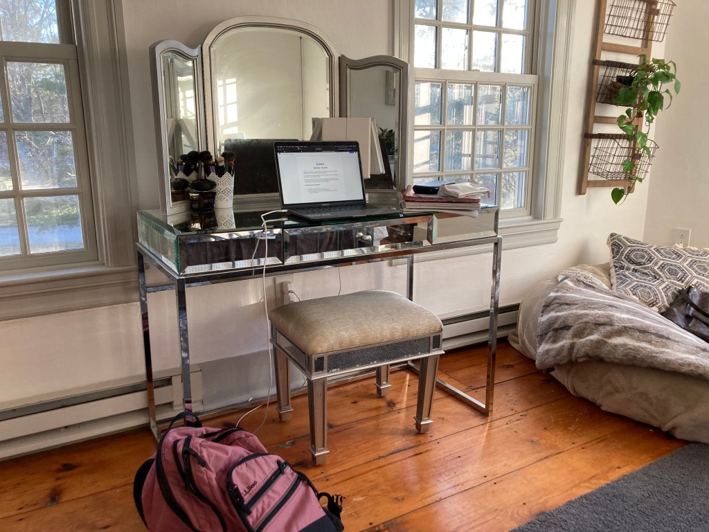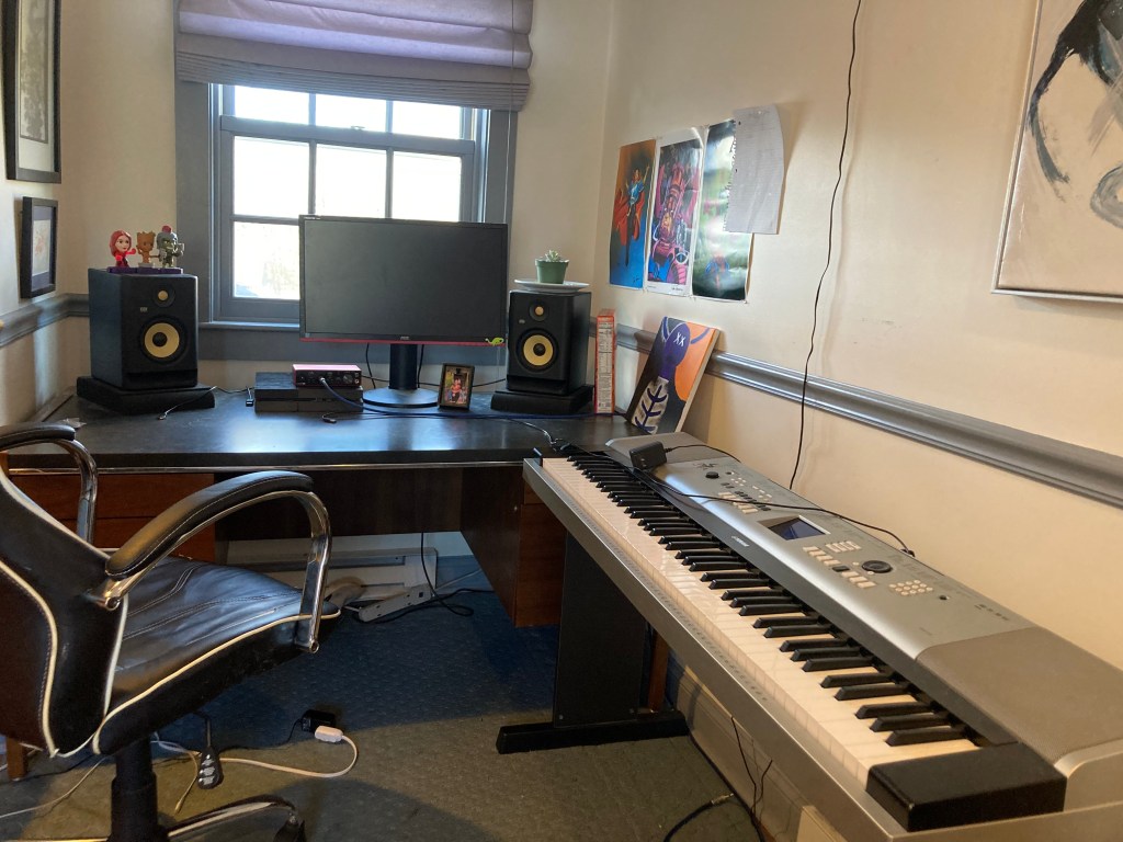 Likewise, everyone in our house has settled in. My son Tristan, taking engineering classes from his bedroom at the University of Massachusetts, has created a desk space that features a keyboard and speakers to accommodate his passion is making/producing hiphop beats between classes.