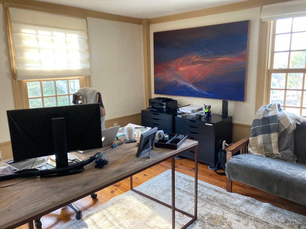 It’s certain that if we had never descended into months of working from home during a pandemic these personal work spaces would not have come to be. I would never have appreciated how cool my son is–sad to say, but I think it’s probably true. Or that my daughter would want to be able to monitor her appearance throughout the school day.
