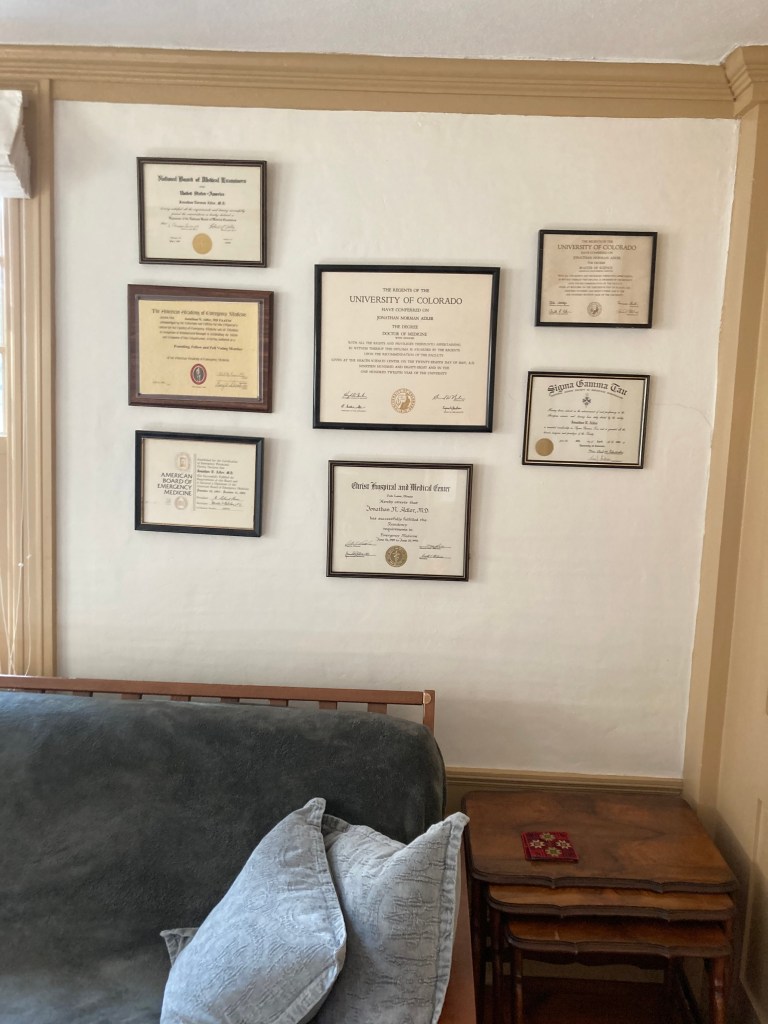 My husband Jon, an entrepreneur and emergency physician, had an office that was not well organized (it was a mess), had a pile of framed diplomas collecting dust behind a door, and boasted the ugliest area rug ever created. Inga and I, sick of looking at it, went out shopping when he was at the hospital one night and got him a new carpet, replacing it and organizing his desk and surrounding space before he returned from his shift.