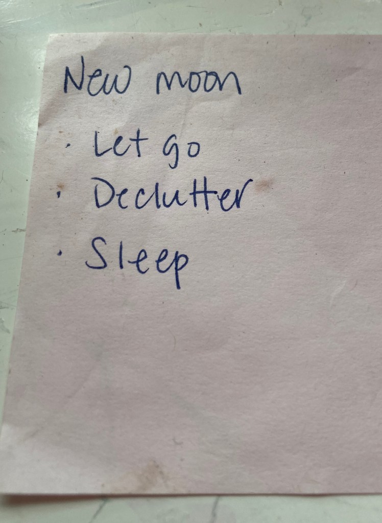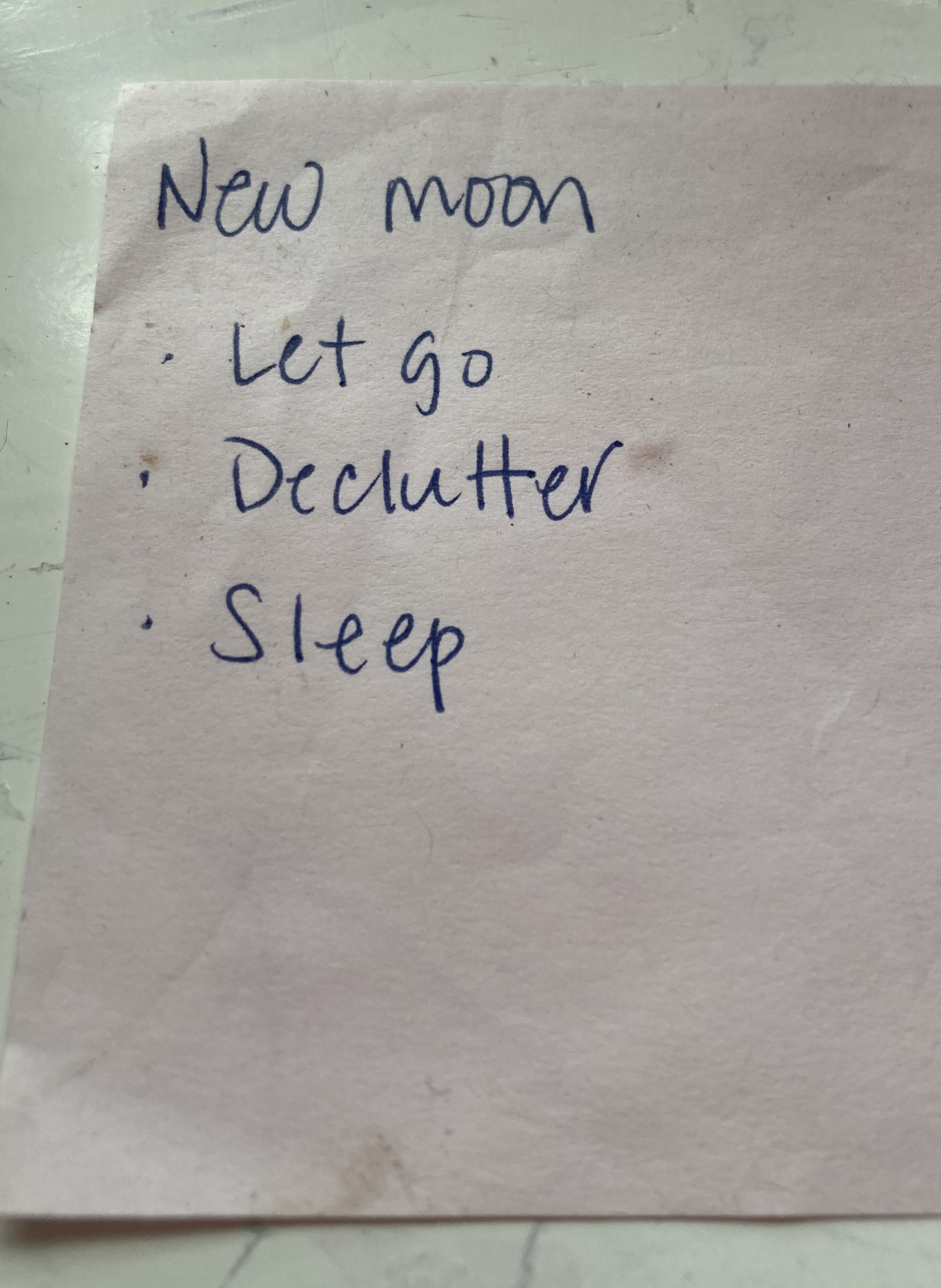 I’ve kept a stickie by my computer monitor for years that says: New Moon. Let Go, Declutter, Sleep.
