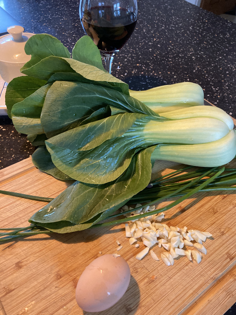 I fished out an old recipe for soy-orange glazed salmon that uses Bok Choy in the vegetable fried rice and cut some chive from our garden in lieu of the spring onions and away we go.