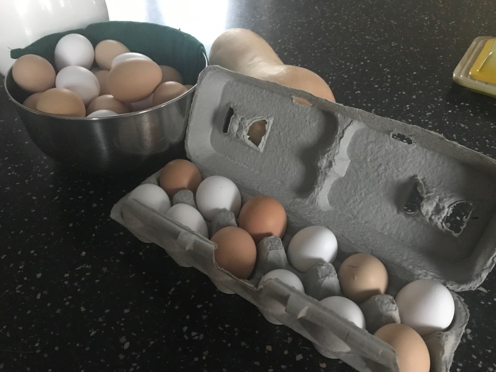 Now our girls, based on my advanced math (number of eggs – number of chickens), produce more than one egg per chicken on some days. And even though I love to cook and bake– and I really like scrambled eggs with fresh chives from the kitchen garden and flourless chocolate cake– that is just too many eggs for us to eat.