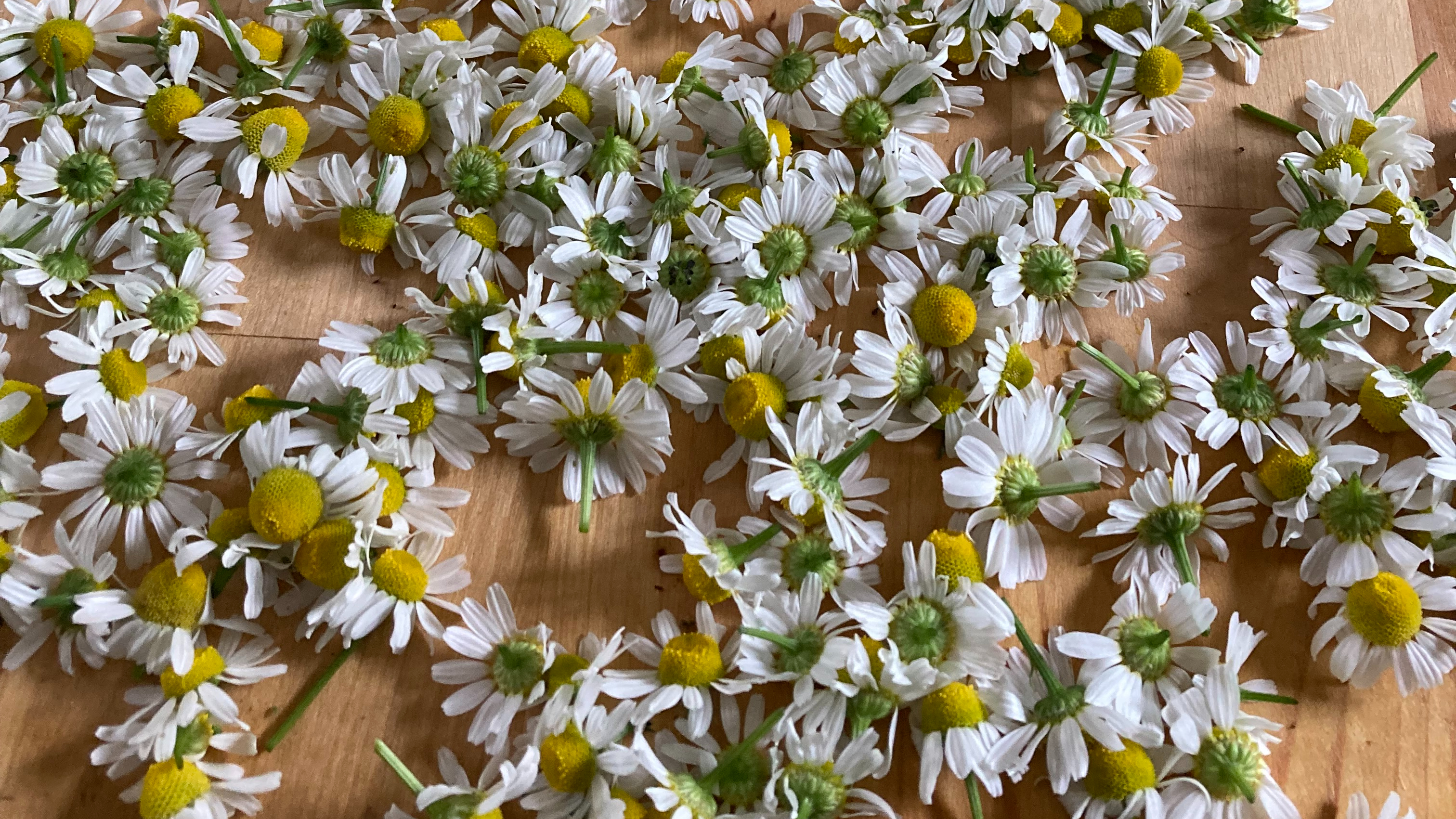 The photo at top was taken just after cutting some of the flower heads the week before last. It’s not easy! Leaning over a patch of chamomile and carefully cutting the flowers into a bowl takes some back strength! But I had a bowl of beautiful, delicate flowers to show for my efforts when I was done. Here they are drying on a board: