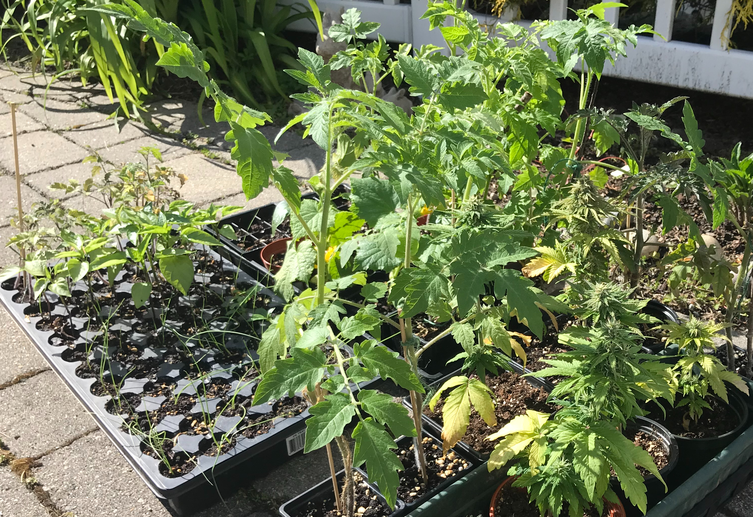 leek and tomato seedlings in the spring sun