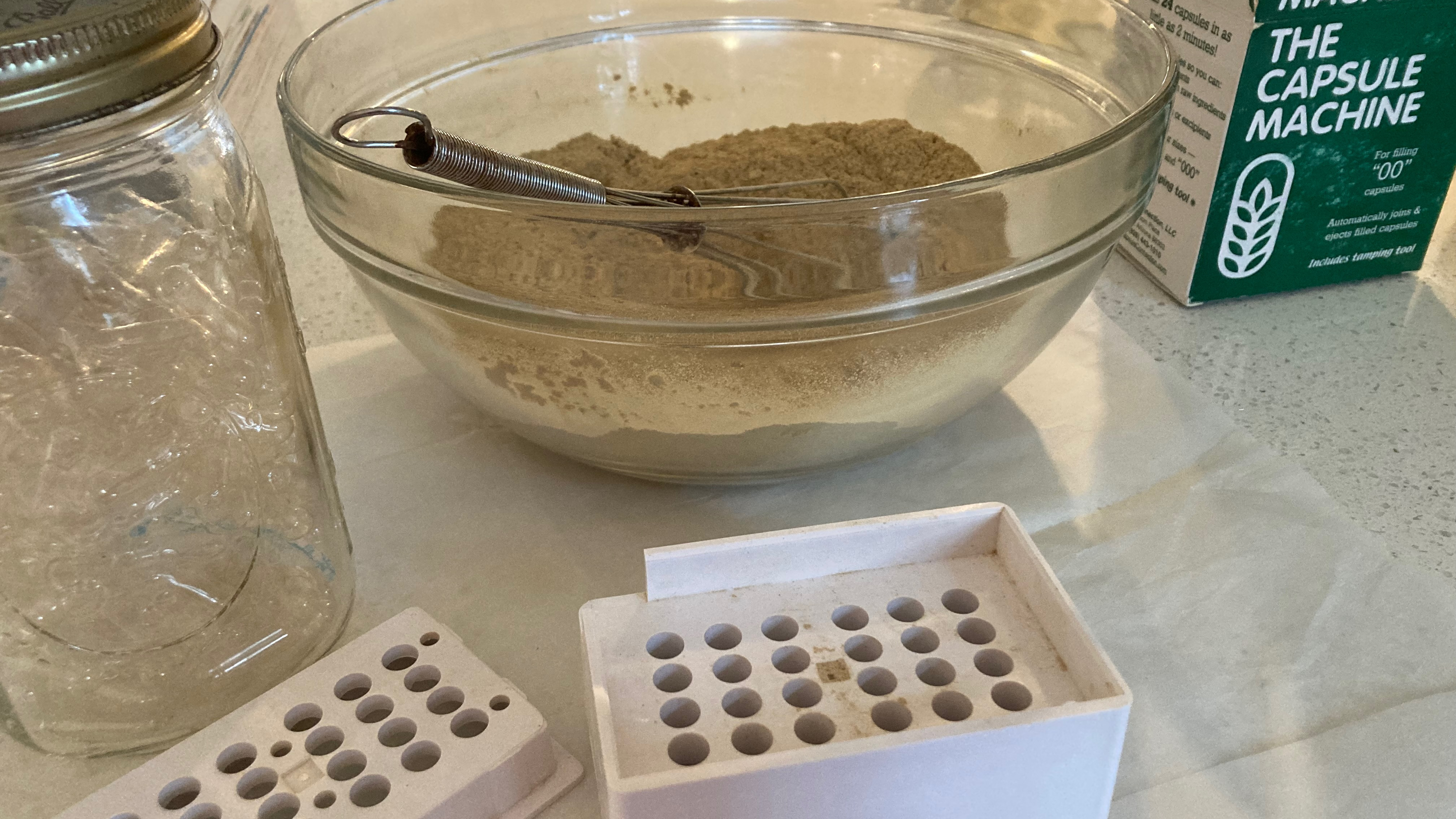 the individual ingredients in Roberts formula pictured here and combined at front in a mixing bowl before encapsulating