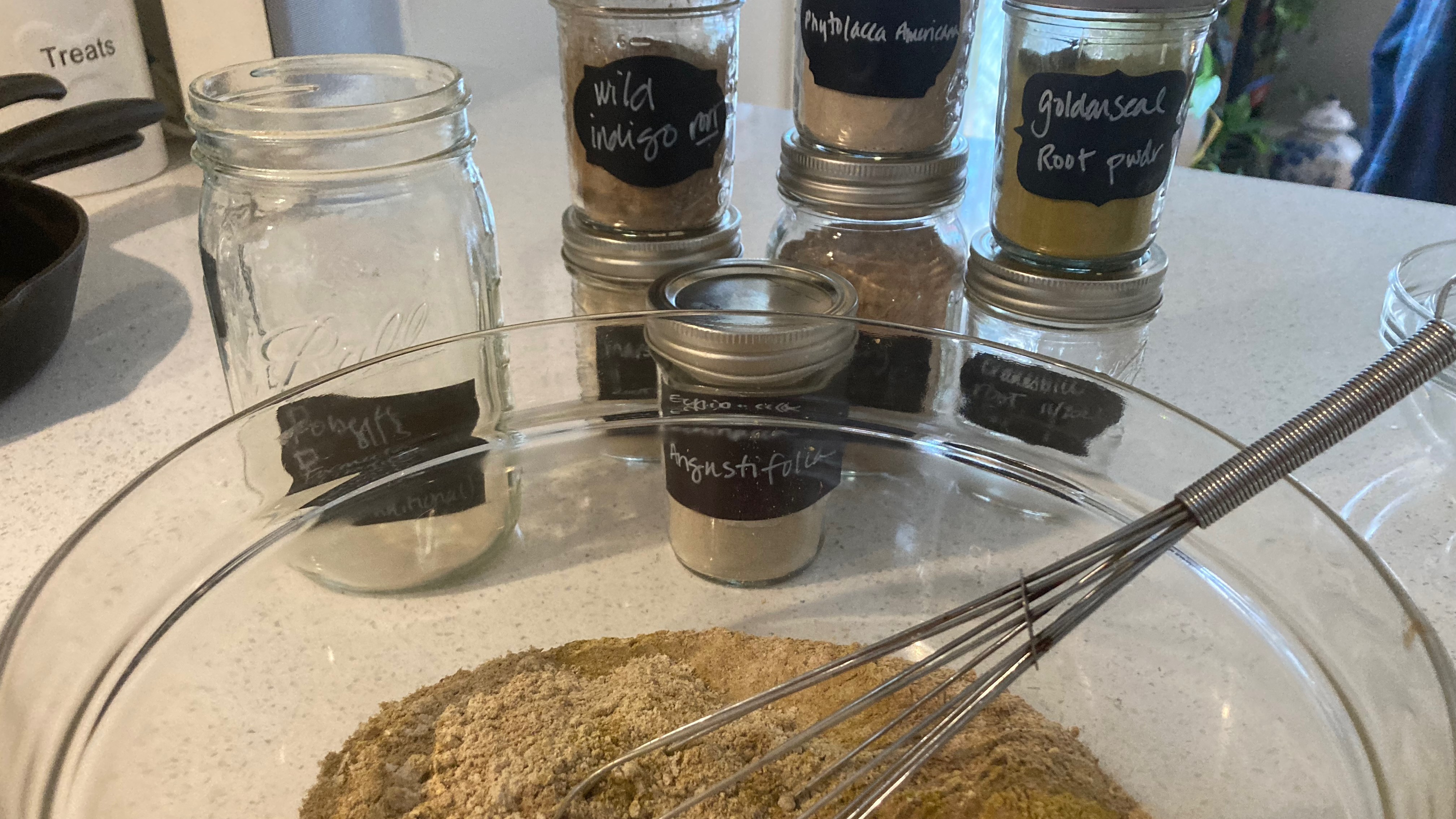 When the herbs arrived I had to grind some in order to be able to compound them, so I spent a Saturday morning grinding and combining them in equal parts. The old formula did not specify the quantity or ratio of each herb. I know from my herbal studies that often we combine in equal parts unless we know an herb (like cayenne or in goldenseal, for example) should be used more sparingly. I made the decision to combine them in equal parts.